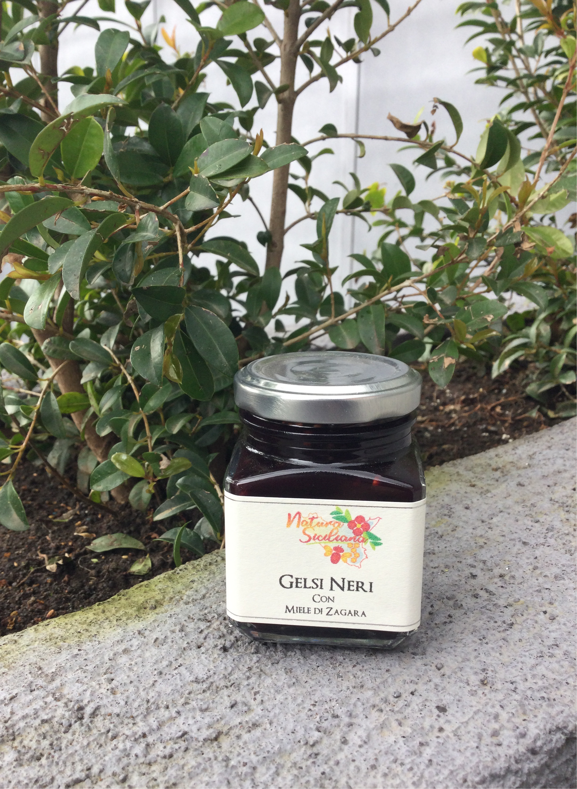 INGREDIENTI( dose per 120 gr.): gelsi neri, zucchero, succo di limone, miele di zagara(2,5%), pectina.